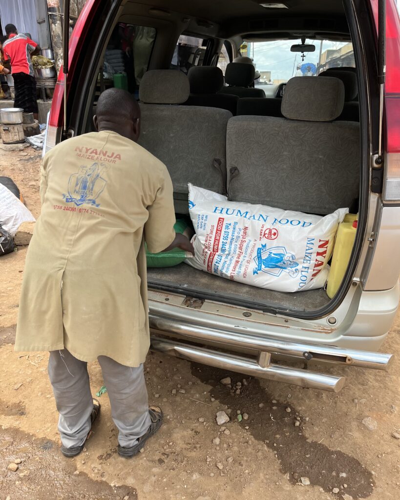 We bought rice, beans, posho (maize flour), sugar, and oil—enough to feed the boarding students for two to three weeks. There are about thirty children, including around ten orphans who never leave the school.
